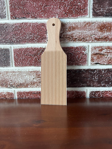 The Gnocchi/Cavatelli Board is a specialized wooden surface designed for the efficient preparation of gnocchi and cavatelli pasta. Its textured surface enables optimal traction for rolling dough, ensuring consistent shape and size for each piece. This tool enhances overall cooking performance, contributing to uniform cooking and improved texture.